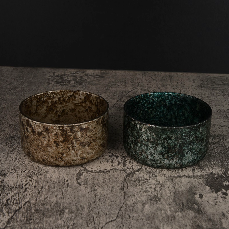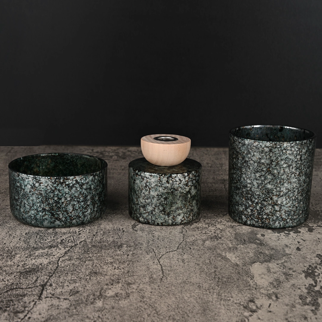 Cette série utilise un traitement de surface d'inspiration minérale sur le verre, créant une texture vintage semblable à de la pierre avec de la profondeur, et non une couche décorative. Chaque récipient varie naturellement, donnant à la collection un aspect artisanal qui se démarque sans graphismes ni étiquettes.