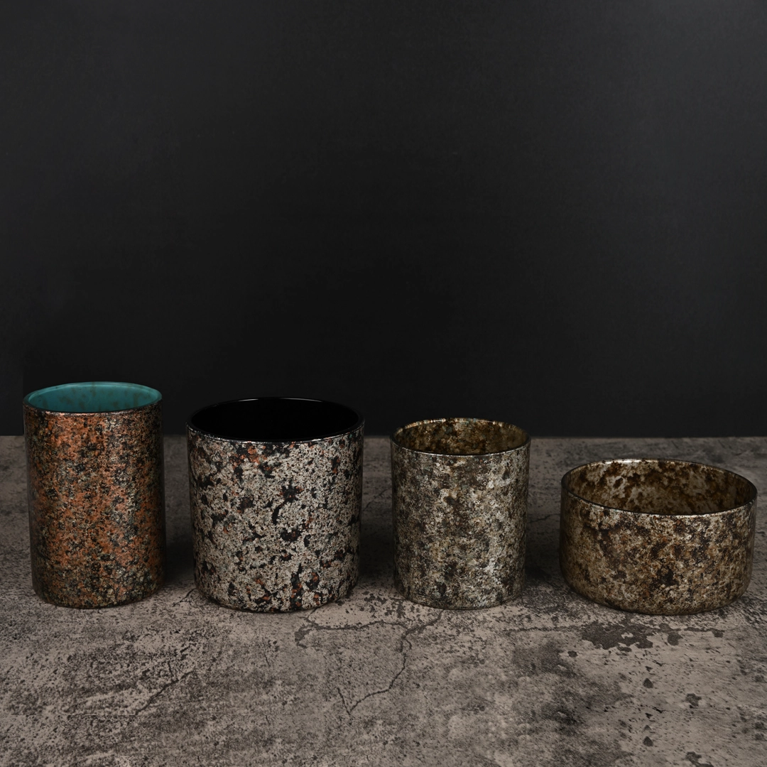 Fornitore di vasetti per diffusori di aromi con spedizione DDP | Questa serie utilizza un trattamento superficiale di ispirazione minerale nel vetro, creando una texture vintage simile alla pietra con profondità, non uno strato decorativo. Ogni vaso varia in modo naturale, conferendo alla collezione un aspetto artigianale che risalta senza grafica o etichette.