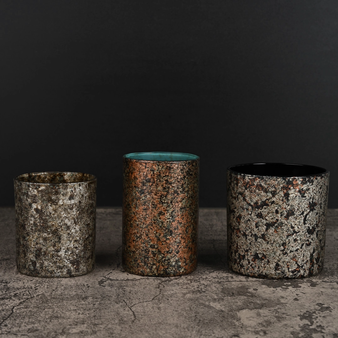 Questa serie utilizza un trattamento superficiale di ispirazione minerale nel vetro, creando una texture vintage simile alla pietra con profondità, non uno strato decorativo. Ogni vaso varia in modo naturale, conferendo alla collezione un aspetto artigianale che risalta senza grafica o etichette.