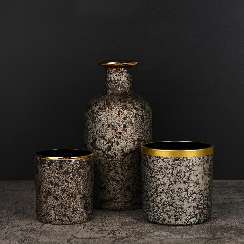 This series uses mineral-inspired surface treatment in glass, creating a vintage, stone-like texture with depth, not a decorative layer. Each vessel varies naturally, giving the collection an artisanal look that stands out without graphics or labels.